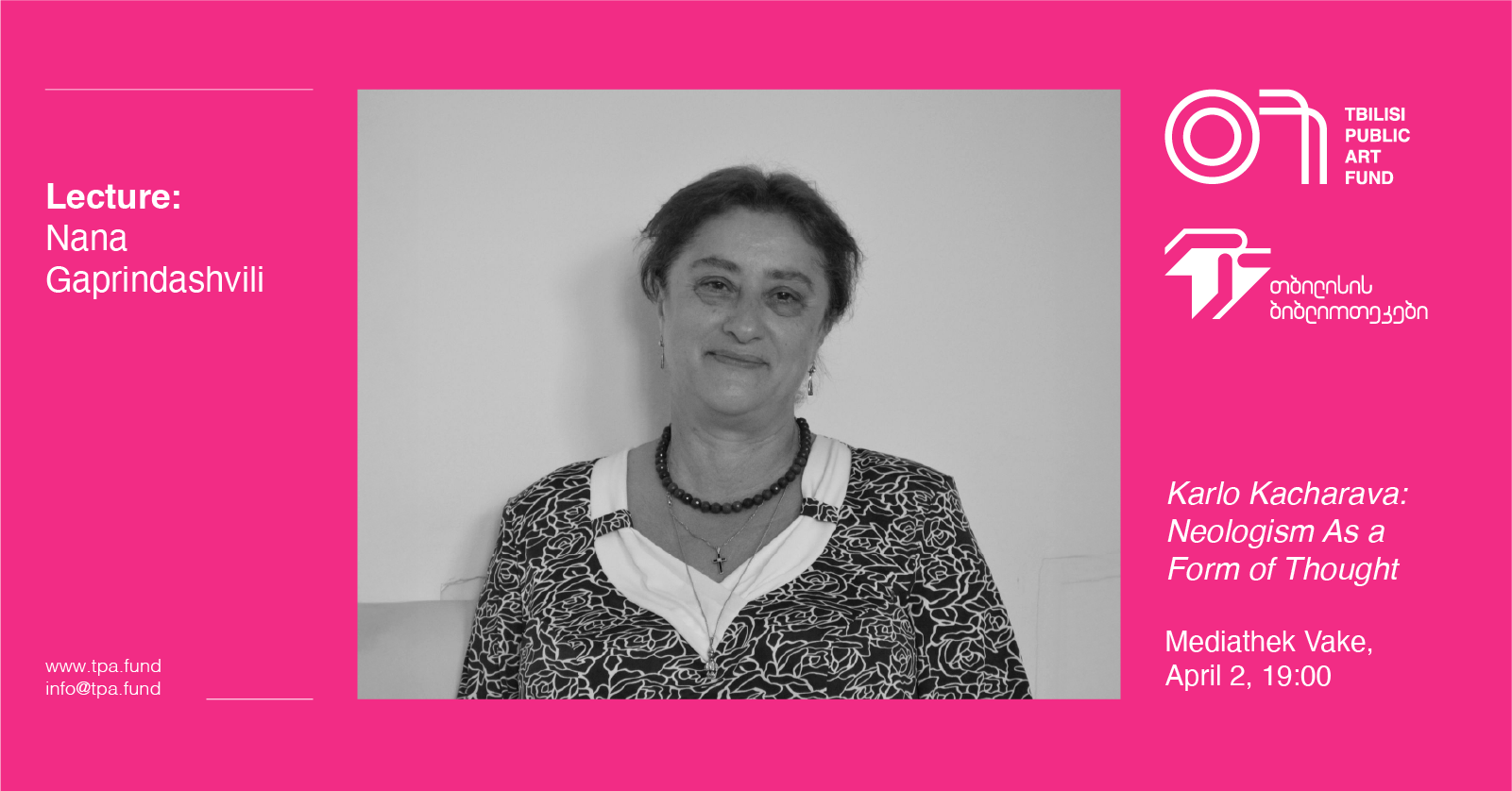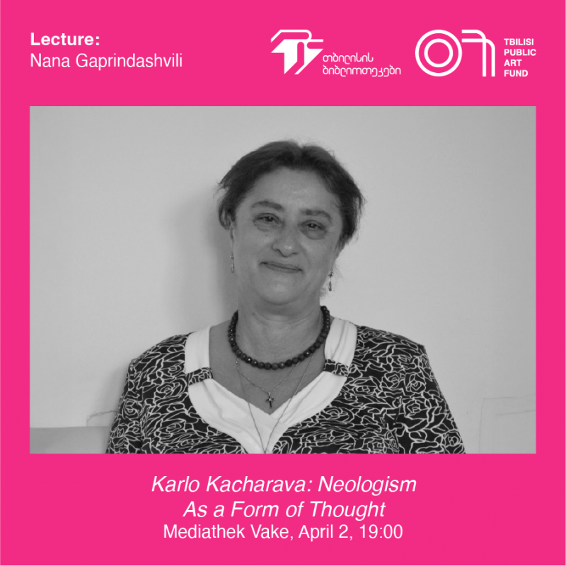 Tbilisi Public Art Fund is pleased to present a lecture by Doctor of Philology, Professor Nana Gaprindashvili ‘Karlo Kacharava: Neologism as a Form of Thought.’ The lecture is dedicated to one of the most significant features of Karlo Kacharava’s poetic language — his authorial neologisms, which have not yet become the subject of specialized scholarly research.