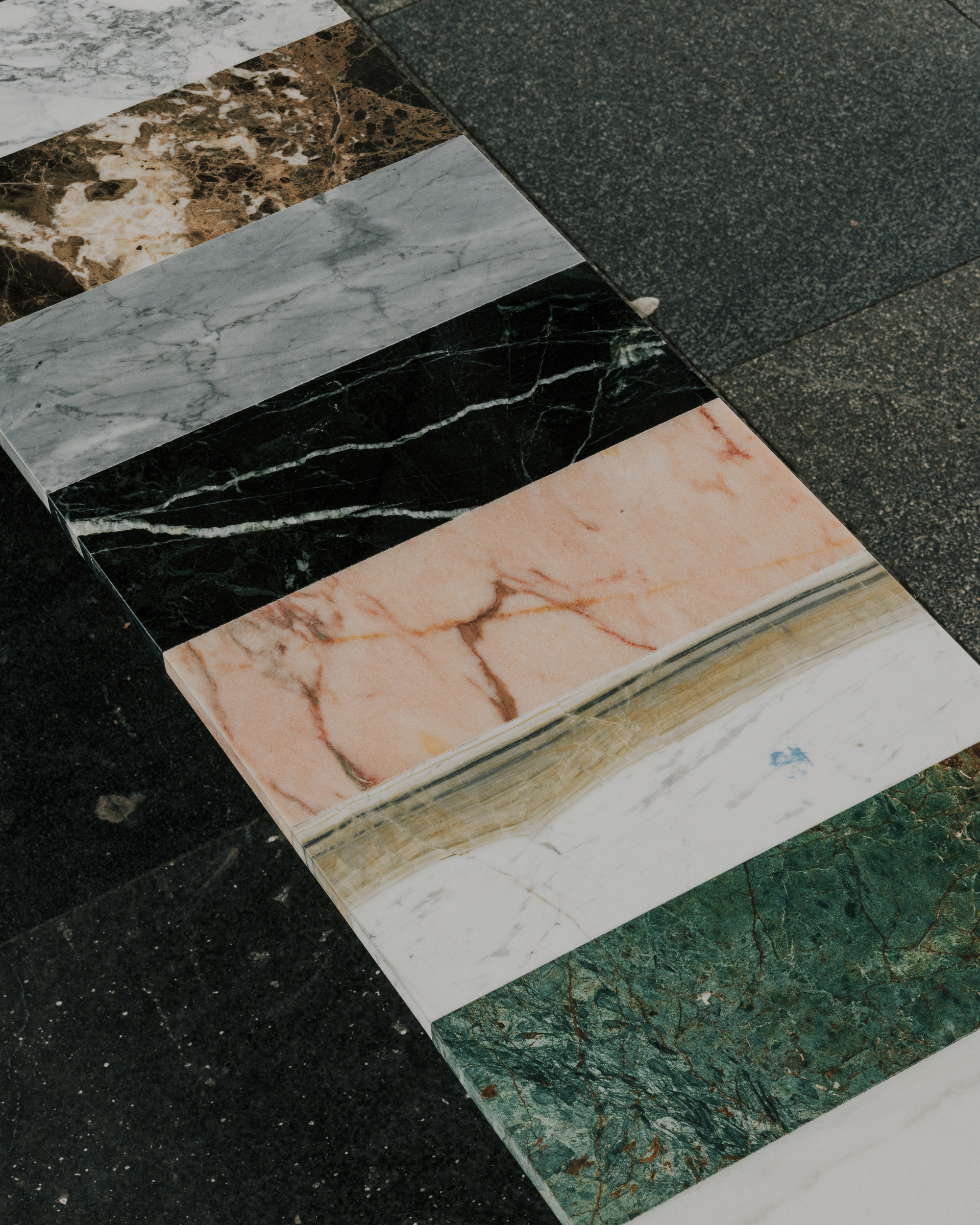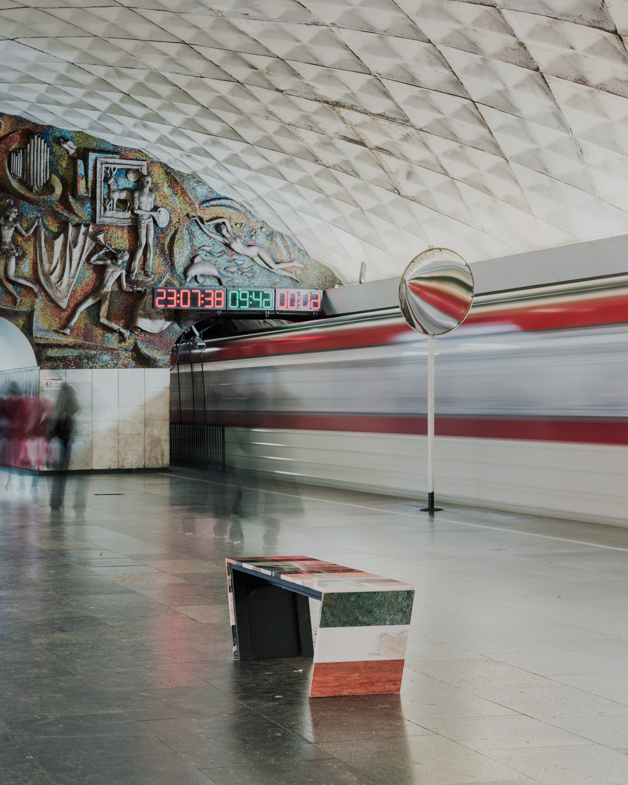 მატერიალური მხარე ასეთივე სიზუსტით არის დამუშავებული. სკამები შედგენილია სხვადასხვა ტიპის მარმარილოსგან, რომლებიც გაერთიანებულია ძლიერ კომპოზიციაში. ქვის სხვადასხვა ტონალობები ფუნქციონირებს როგორც ზომიერი პალიტრა, რომელიც არ დომინირებს სივრცეში, მაგრამ ახლოს დაკვირვებისას კი მასალის სიმდიდრეს ავლენს. ამავდროულად, ფერთა შეთანხმებები დახვეწილ დიალოგში შედის სადგურის მოზაიკურ პანოსთან. ეს არ არის პირდაპირი ციტატა, არამედ არსებული ვიზუალური ენის გააზრებული გაგრძელება - ზუსტი გამოხმაურება სივრცის ხასიათზე. არ არსებობს გარემოზე დომინირების ან მისი ხელახლა განსაზღვრის არანაირი განზრახვა. პირიქით, პროექტი მოქმედებს პატივისცემით არსებული კონტექსტის - მისი არქიტექტურის, მასშტაბის, სინათლისა და მასალების მიმართ. ასეთი პოზიცია მოითხოვს გარკვეულ დისციპლინას და პროფესიულ სიმწიფეს: არა მხოლოდ ექსპრესიული ფორმის შექმნის, არამედ პროექტის მიზნების გაგების უნარს.